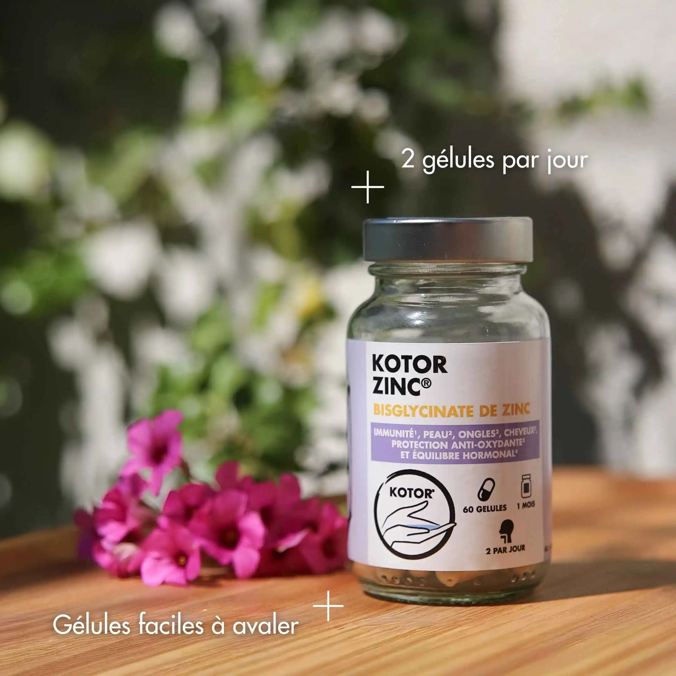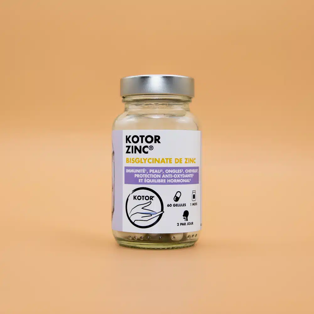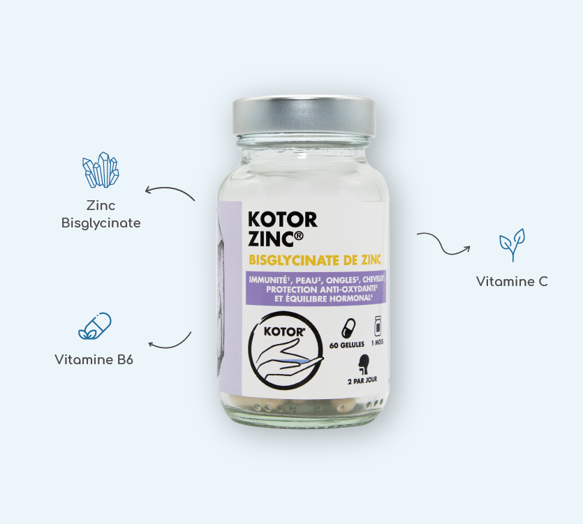 Toutes les formules de zinc ne se valent pas. Kotor Zinc a été conçu pour apporter 100 % des besoins quotidiens en zinc sous forme bisglycinate, une forme reconnue pour sa haute assimilation. Pour maximiser son efficacité, nous l’avons associé à la vitamine C et la vitamine B6, deux nutriments qui participent eux aussi à l’optimisation du système immunitaire et au métabolisme énergétique. Ensemble, ces nutriments soutiennent durablement votre système immunitaire, votre équilibre hormonal, et votre beauté.