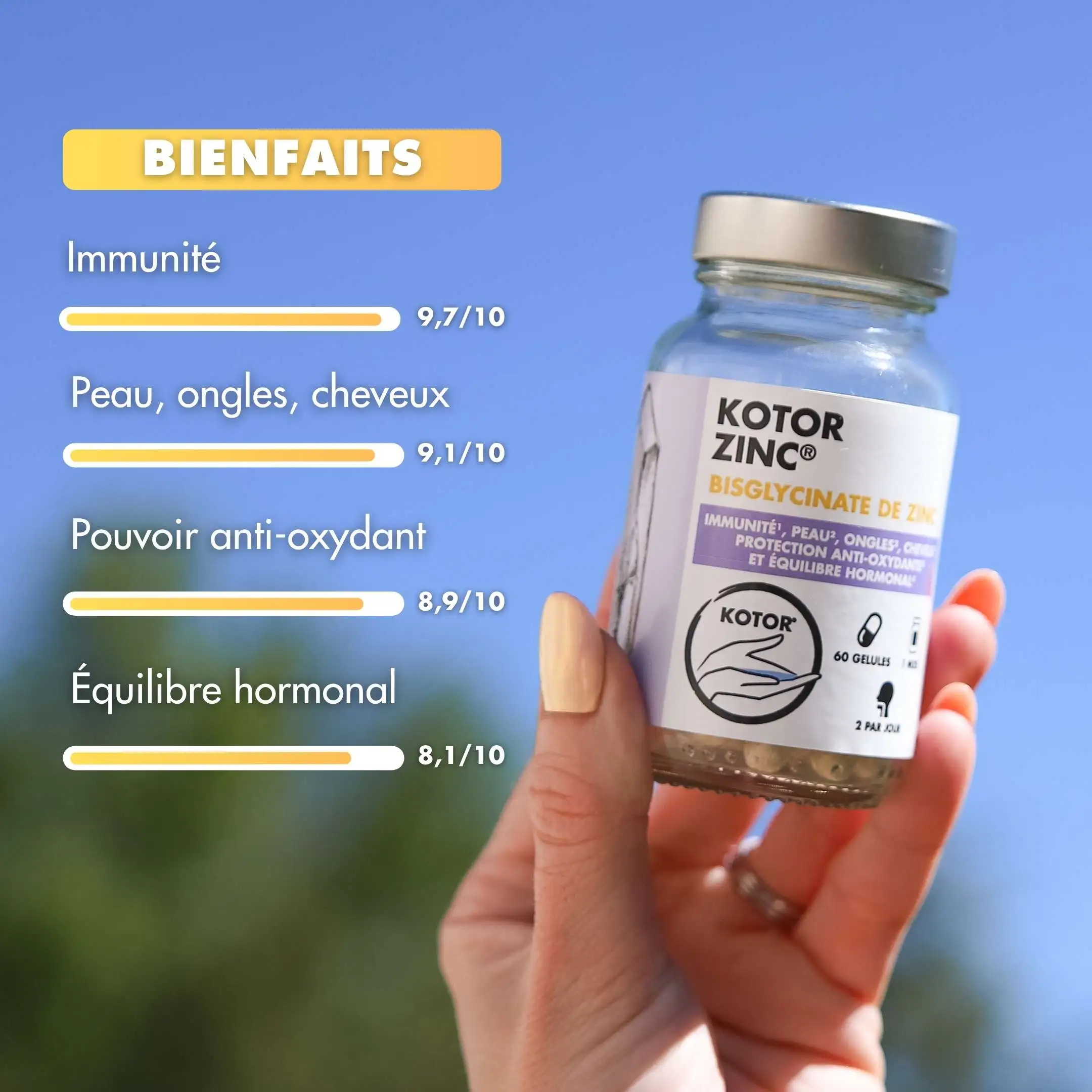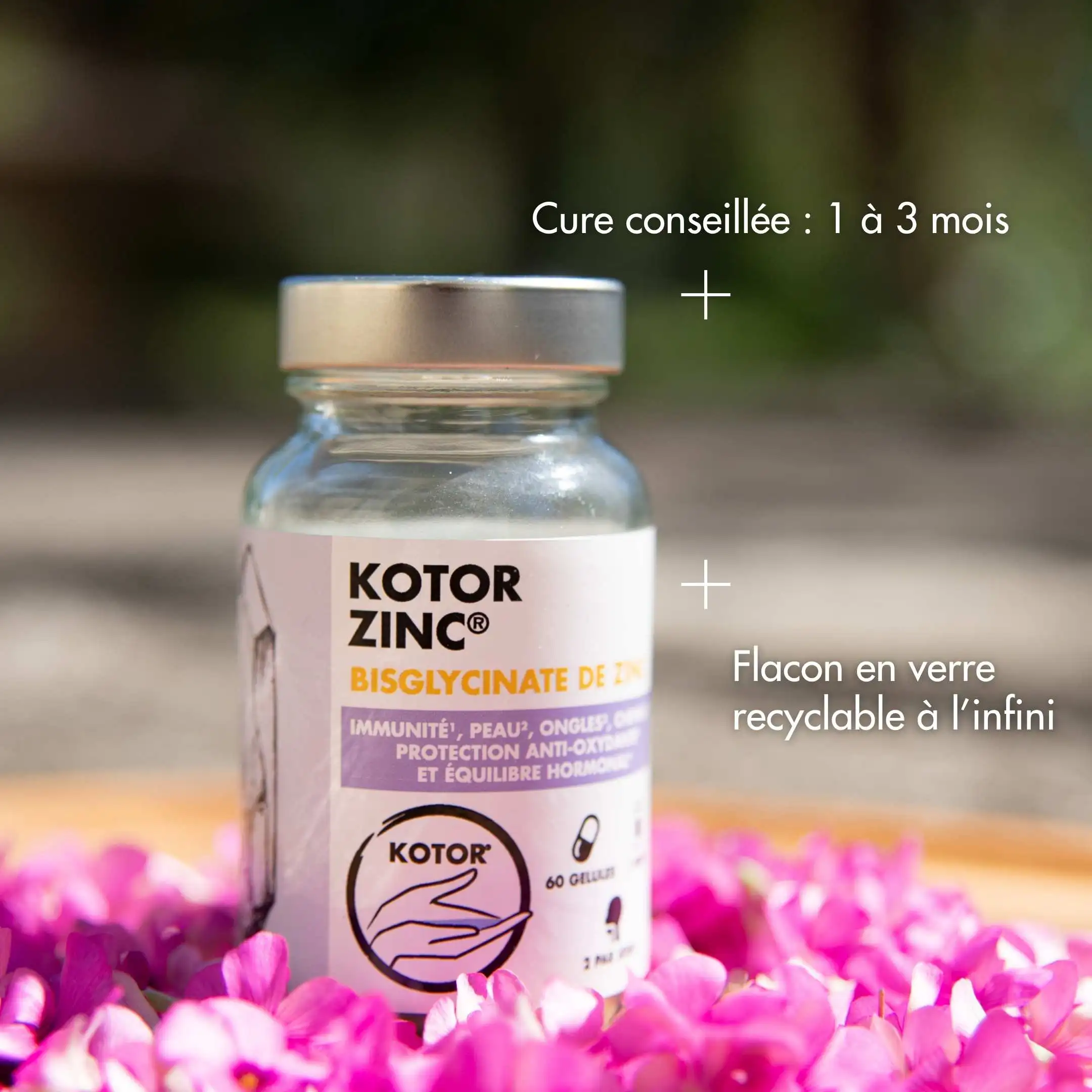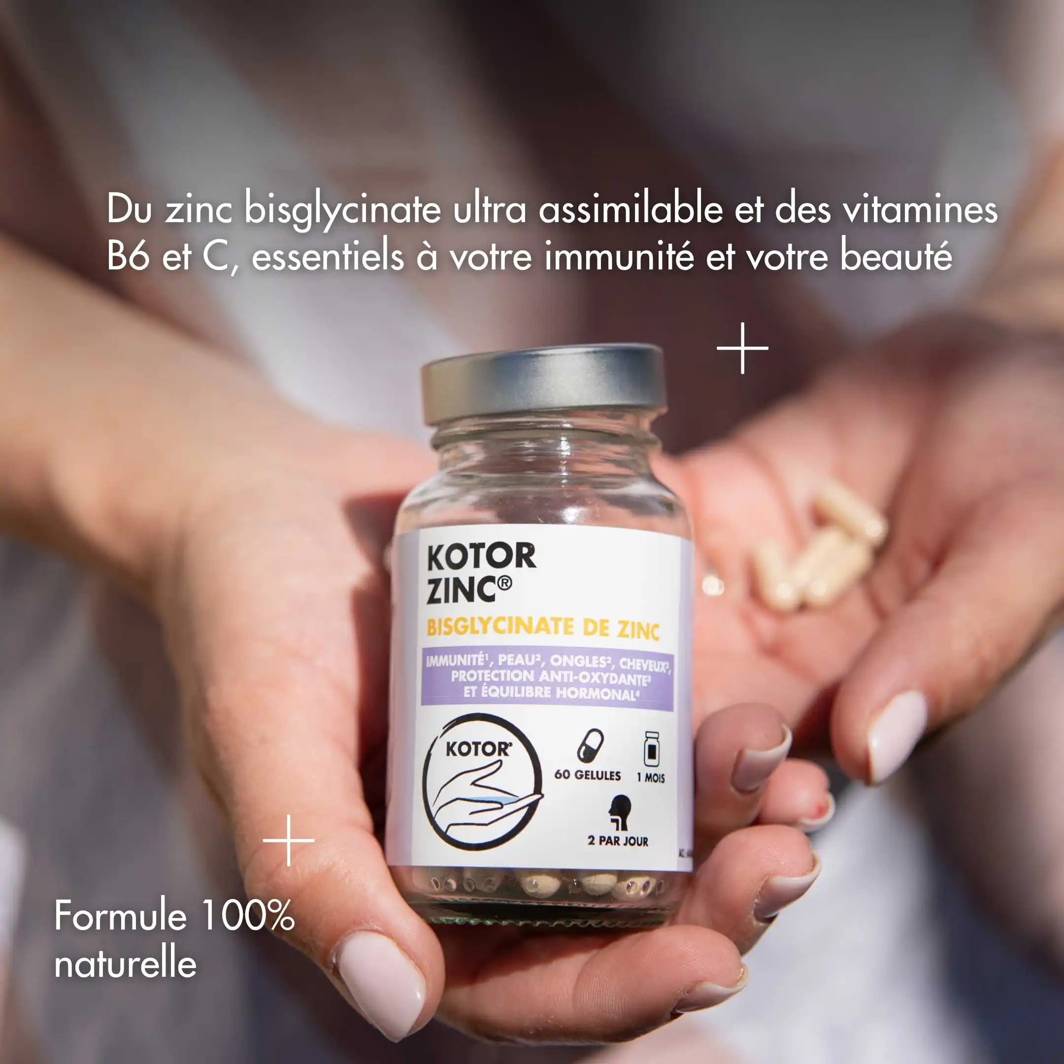 Toutes les formules de zinc ne se valent pas. Kotor Zinc a été conçu pour apporter 100 % des besoins quotidiens en zinc sous forme bisglycinate, une forme reconnue pour sa haute assimilation. Pour maximiser son efficacité, nous l’avons associé à la vitamine C et la vitamine B6, deux nutriments qui participent eux aussi à l’optimisation du système immunitaire et au métabolisme énergétique. Ensemble, ces nutriments soutiennent durablement votre système immunitaire, votre équilibre hormonal, et votre beauté.